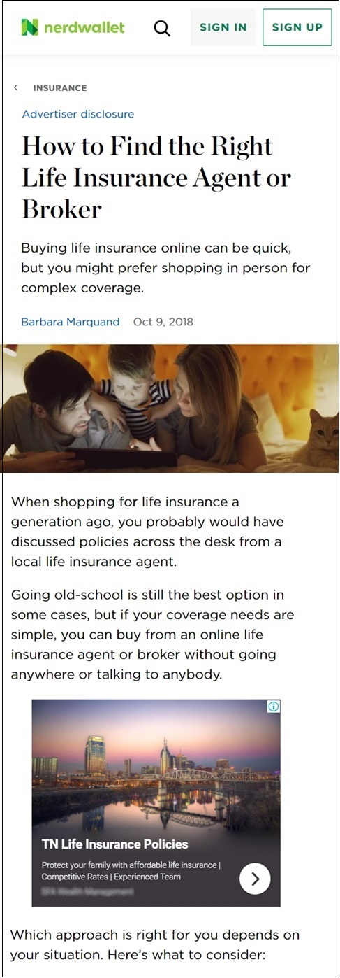 With Display Advertising, we have access to most well-known business and financial websites, apps, and Youtube Channels. We never target entire websites but instead target specific articles and sections of websites. The goal is to replicate the intent that you have with Search ads. In this example, the article “How to Choose an Insurance Company” is likely to be read by a person who is in-market.